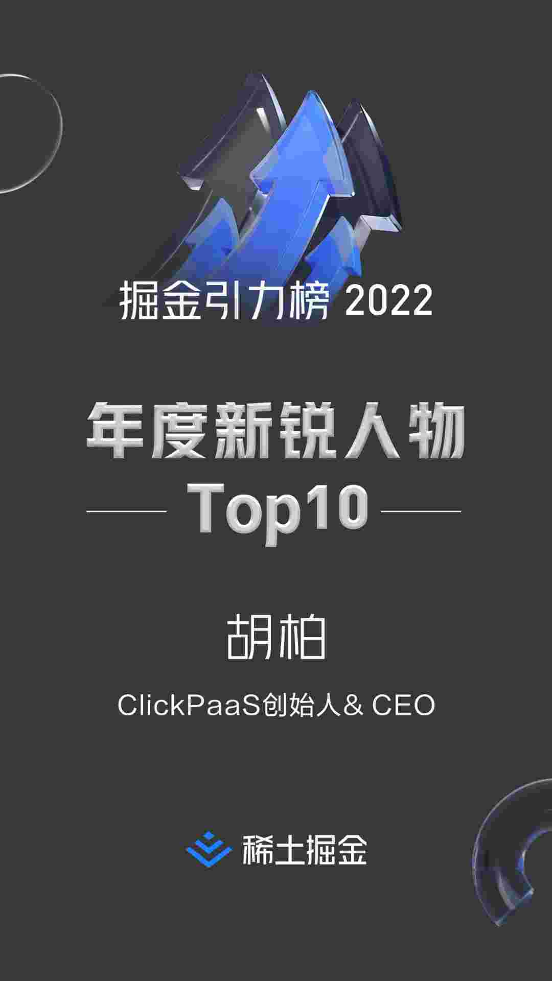 2022年1月6日,,稀土掘金社区第一届「掘金未来大会」成功举办,,会上发布了“2022 稀土掘金引力榜 年度新锐人物”榜单,,,上海爱湃斯科技有限公司(简称圆梦钱包)创始人及CEO胡柏实力入选年度新锐人物TOP 10。。。